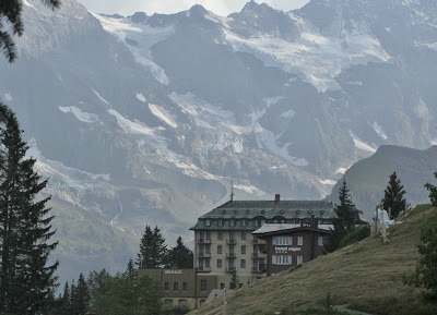 then a gondola up the side of the valley wall, train to Mürren. It was raining as we left, but stopped before we got to Mürren. It was still very cloudy, however. We had great weather after that except for one afternoon thunderstorm.